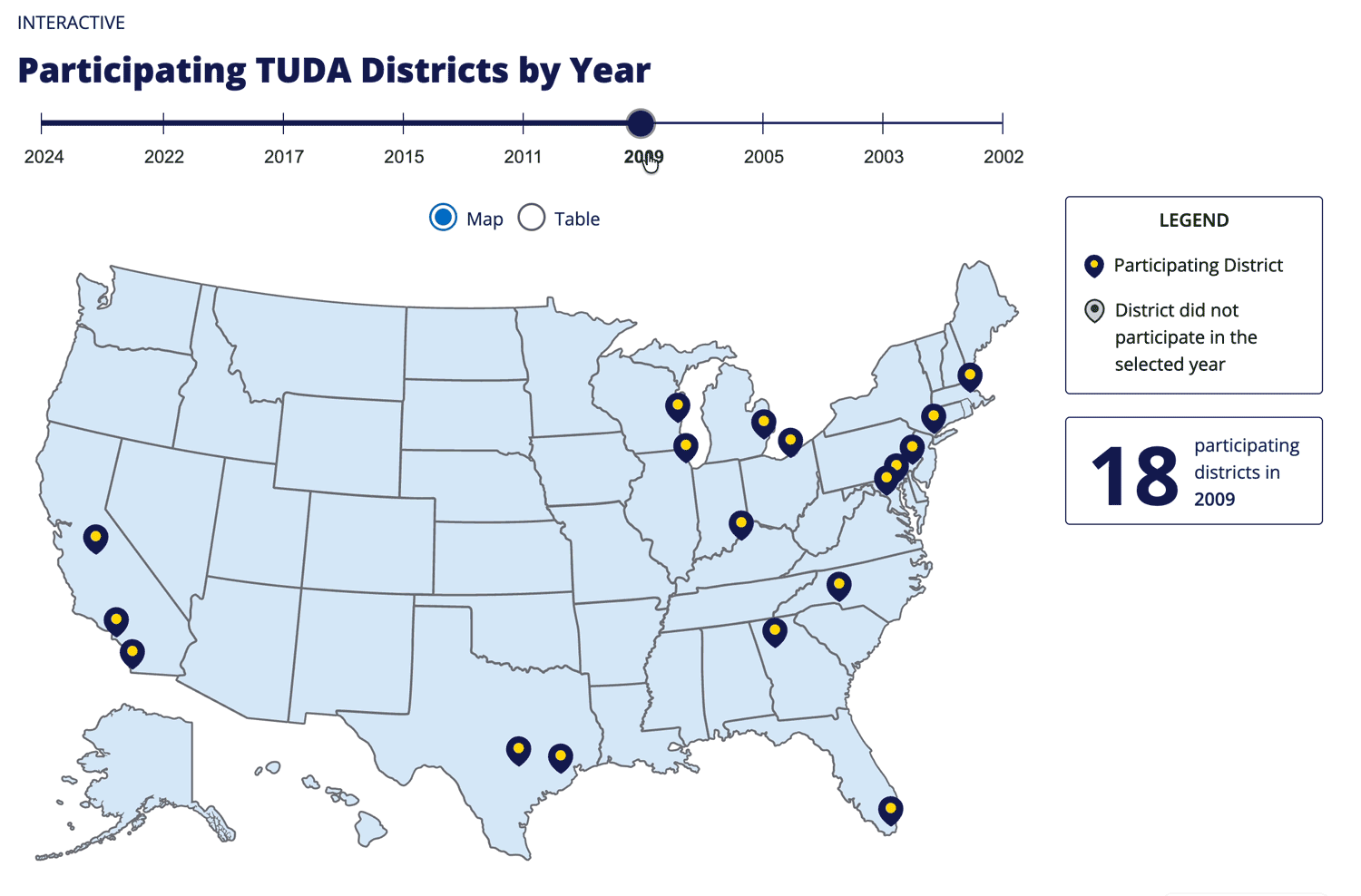 Our team identified an opportunity to transform static image content (over a dozen map images) into an interactive, engaging experience. Our transformed TUDA page tells the story of district growth over time in an immersive digital experience that is accessible and informative.
